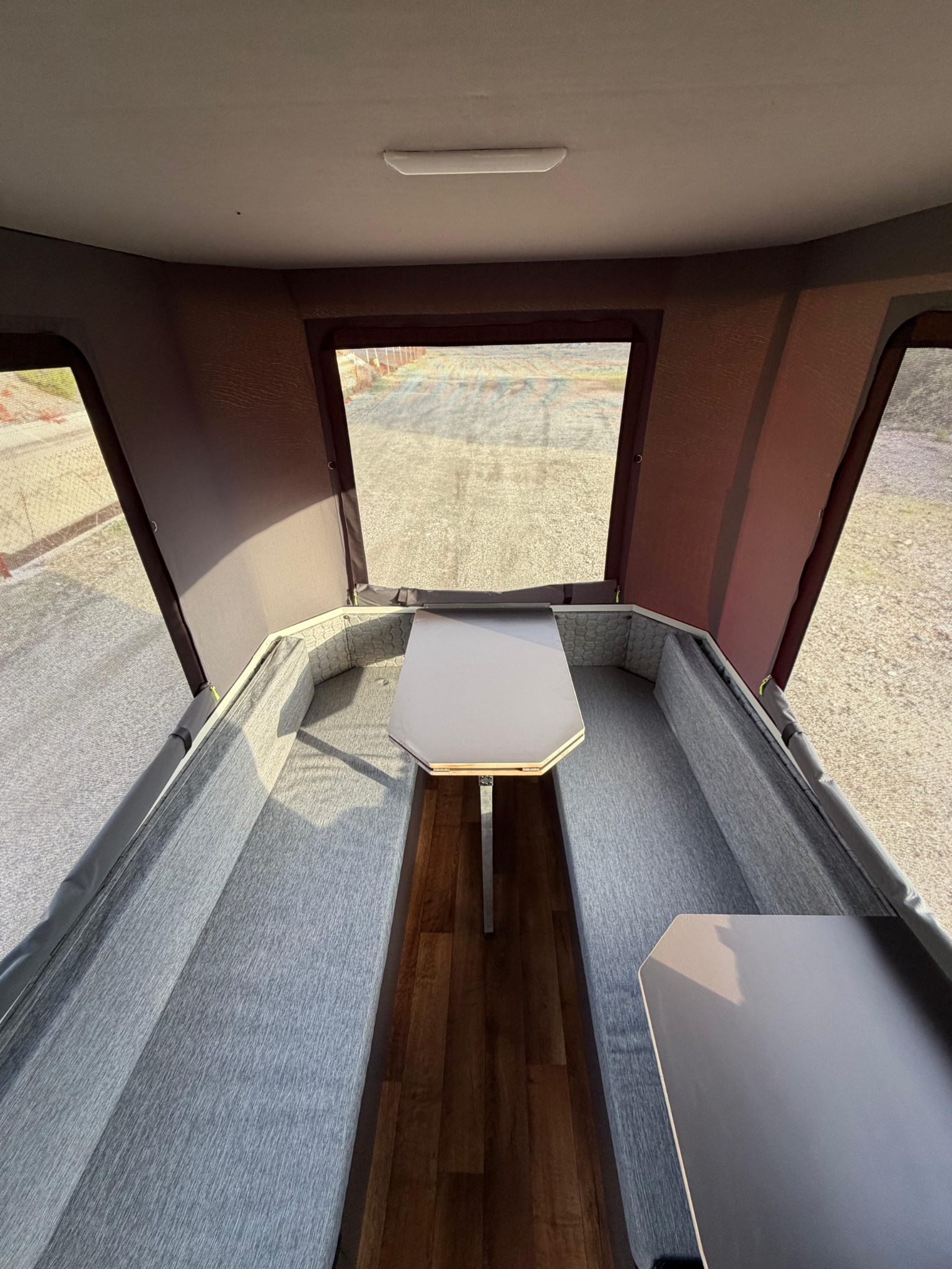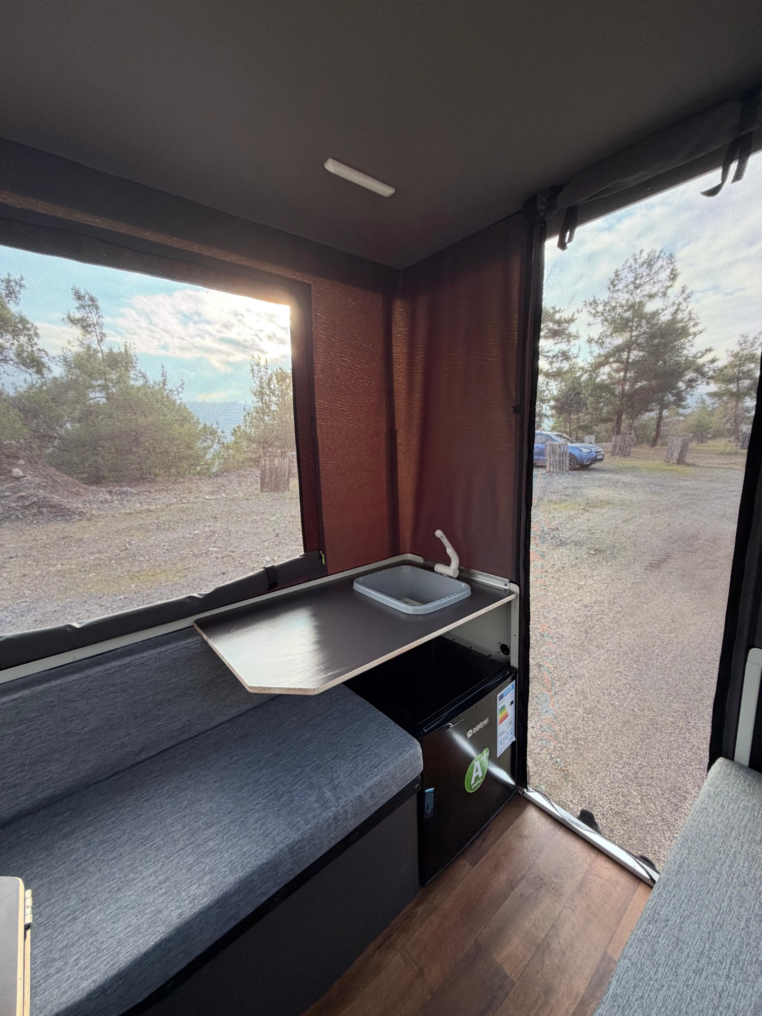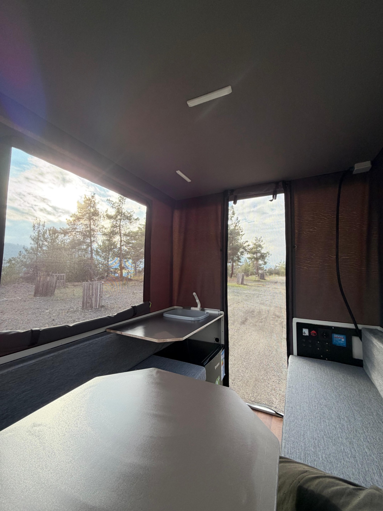 Une fois déployée, la Siesta S-Cross propose un espace intérieur lumineux et bien agencé, avec un couchage confortable, un coin repas convivial et une cuisine pratique, idéale pour les séjours en pleine nature.