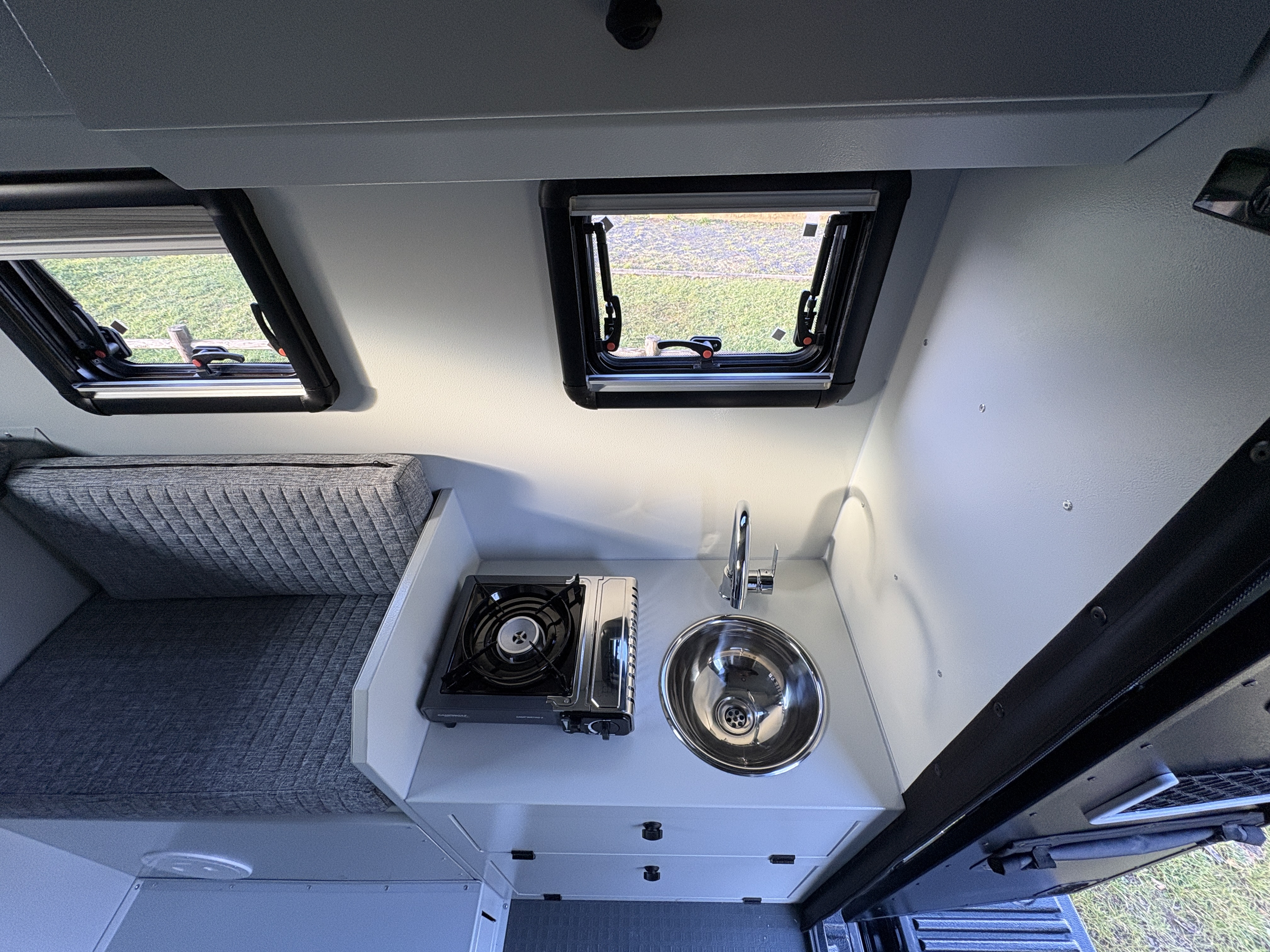 Equipement complet avec une cuisine fonctionnelle, rangements pratiques et une configuration idéale pour le bivouac et Frigo Indel B 49LT