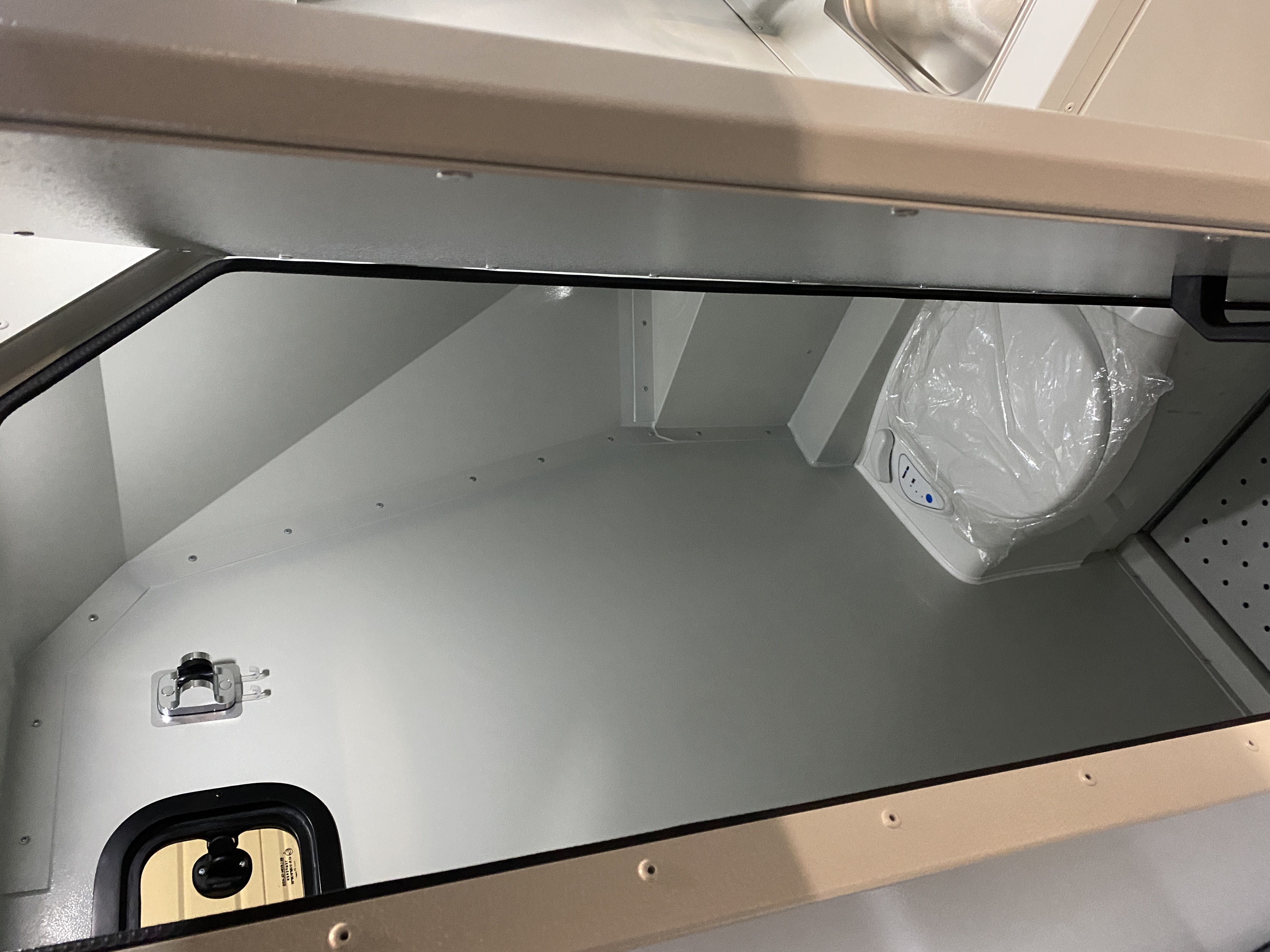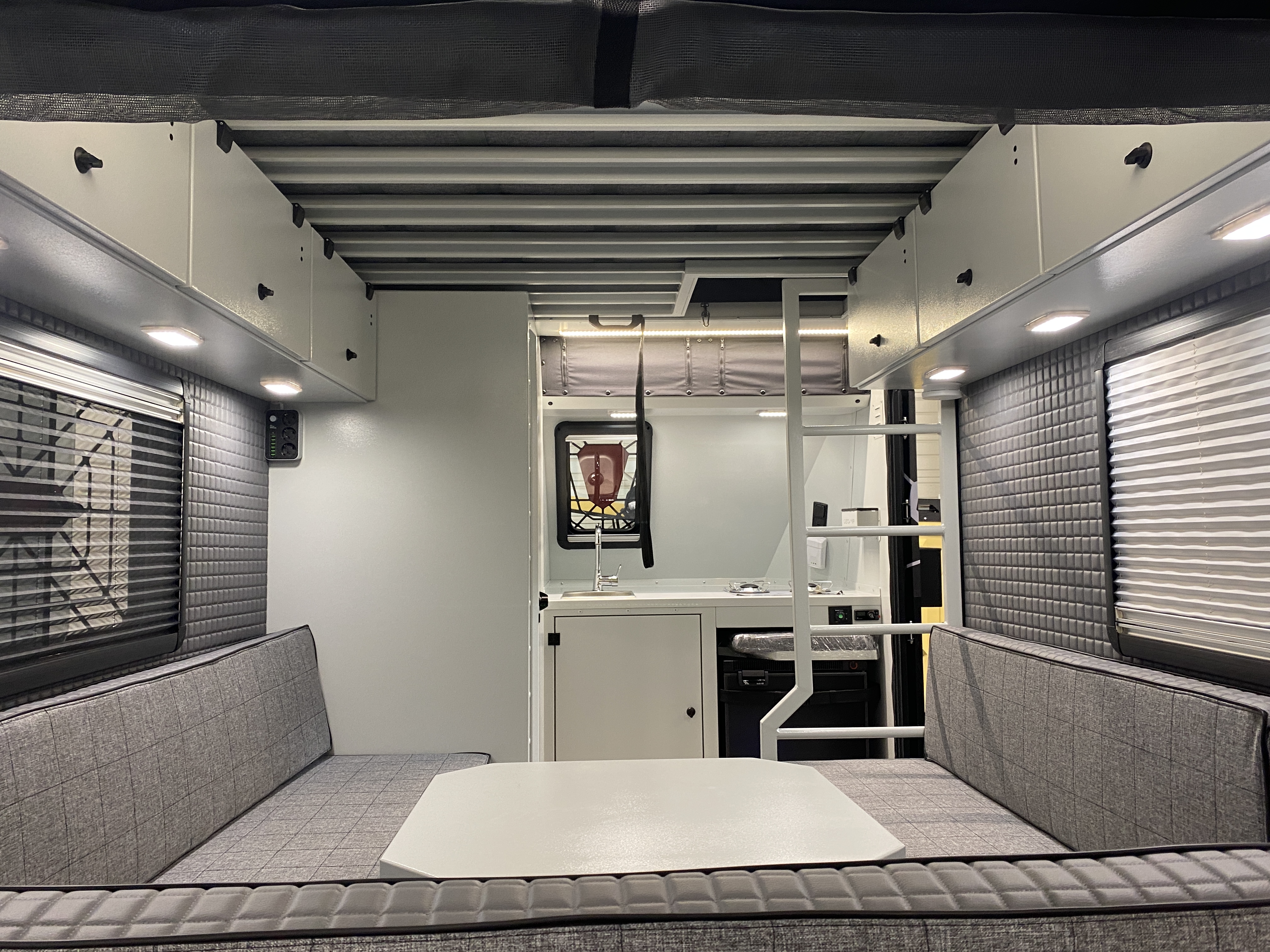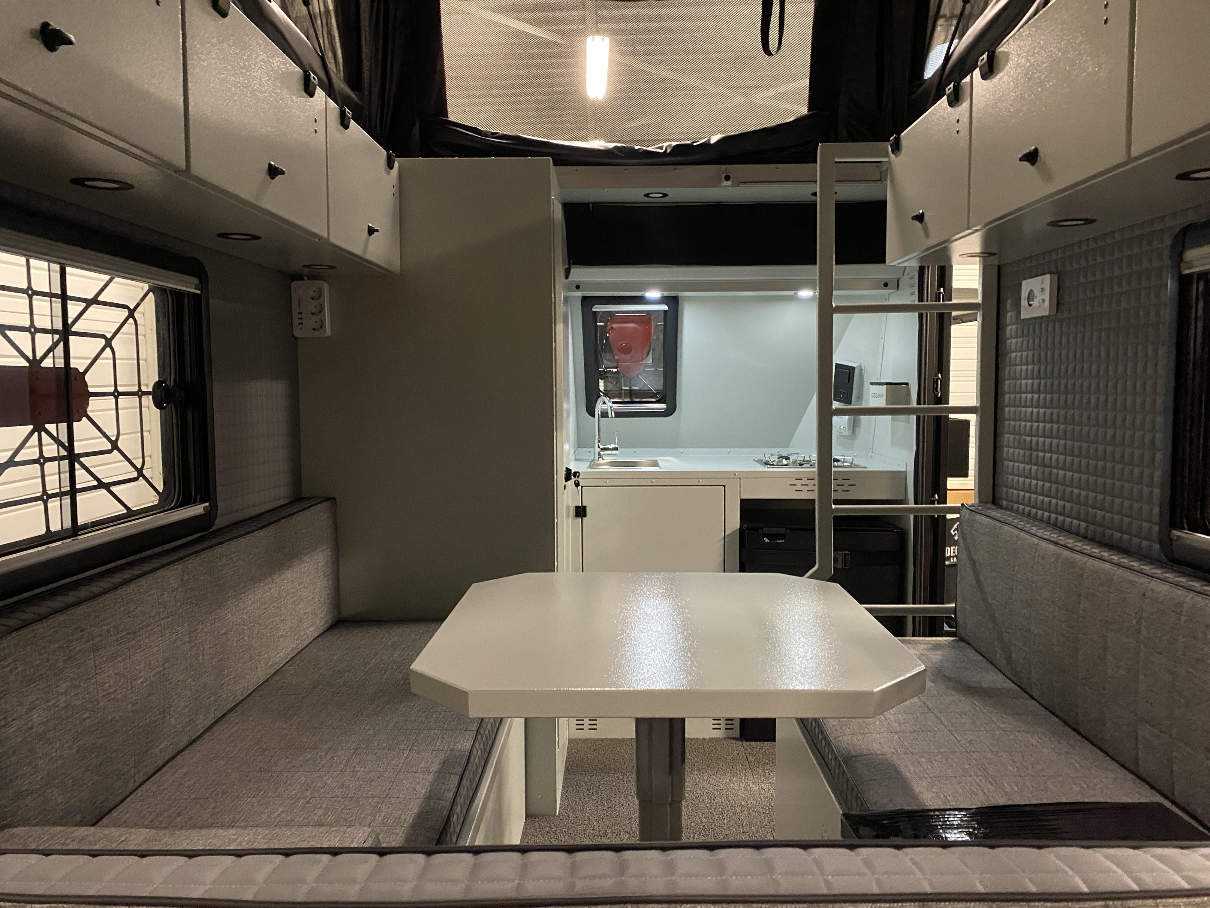 Cuisine : 2 brûleurs à gaz, évier couleur chrome, petit espace de plan de travail, des rangements, 1 prise 220V + 2 prises 12V USB . Espaces de rangements avec casiers de sécurité.