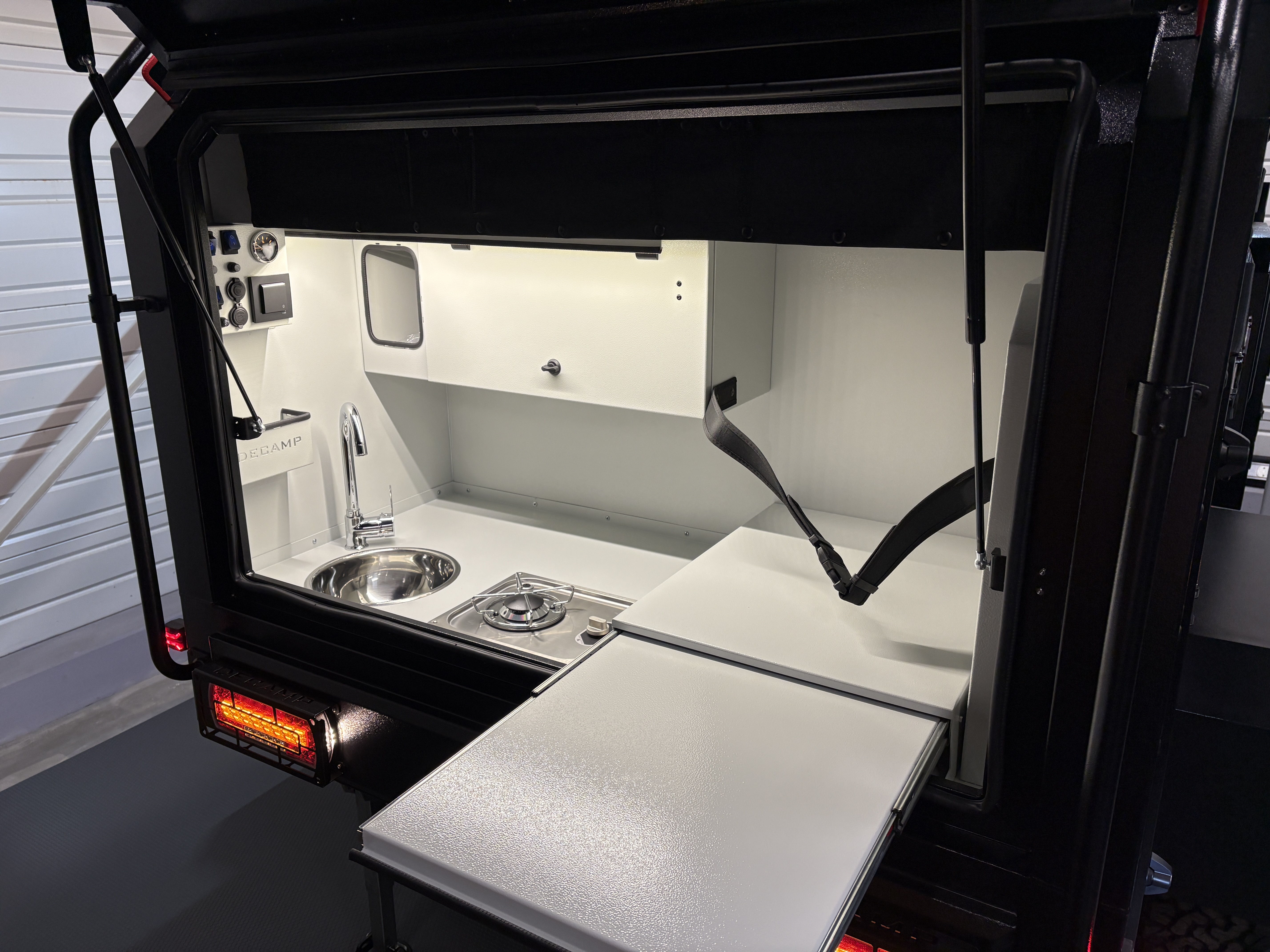 Équipements de la cuisine extérieur : 1 brûleur à gaz, évier avec mitigeur couleur chrome, petit plan de travail, des rangements, 3 prises 220 V, 2 prises USB et 1 prise 12 V allume cigare