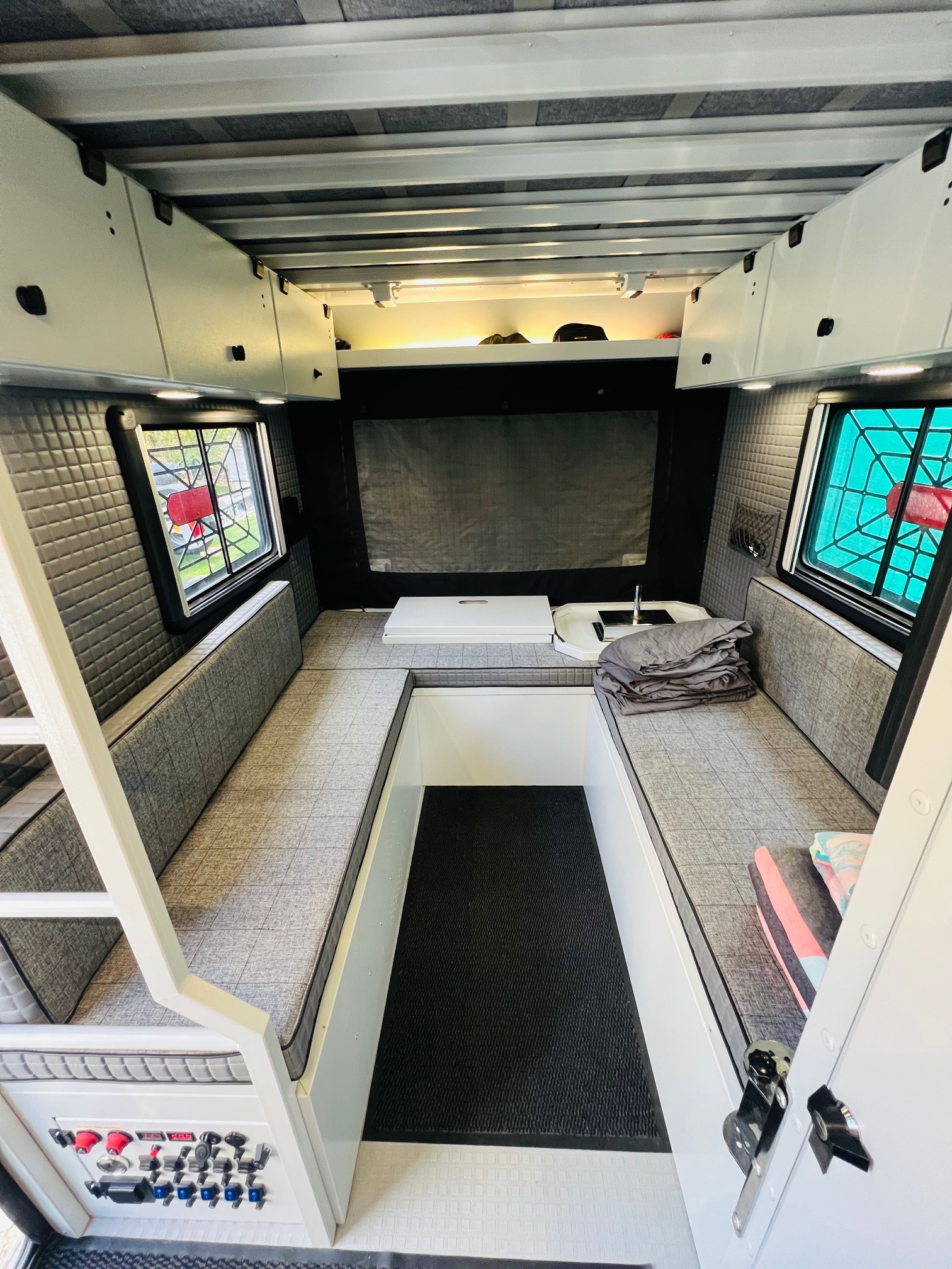 Panneau de contrôle complet comprenant une prise 12V (allume cigare), deux prises USB, une prise 220V, interrupteurs, voltmètre numérique et thermomètre