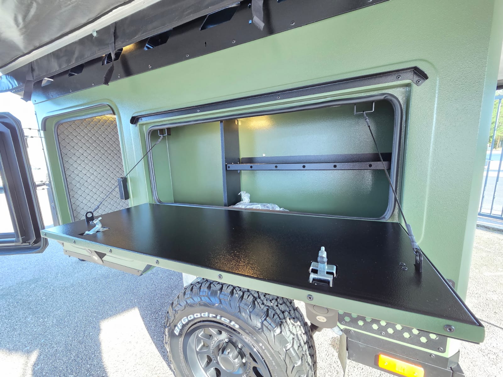 • 2 portes latérales verrouillables avec fenêtres coulissantes, moustiquaires