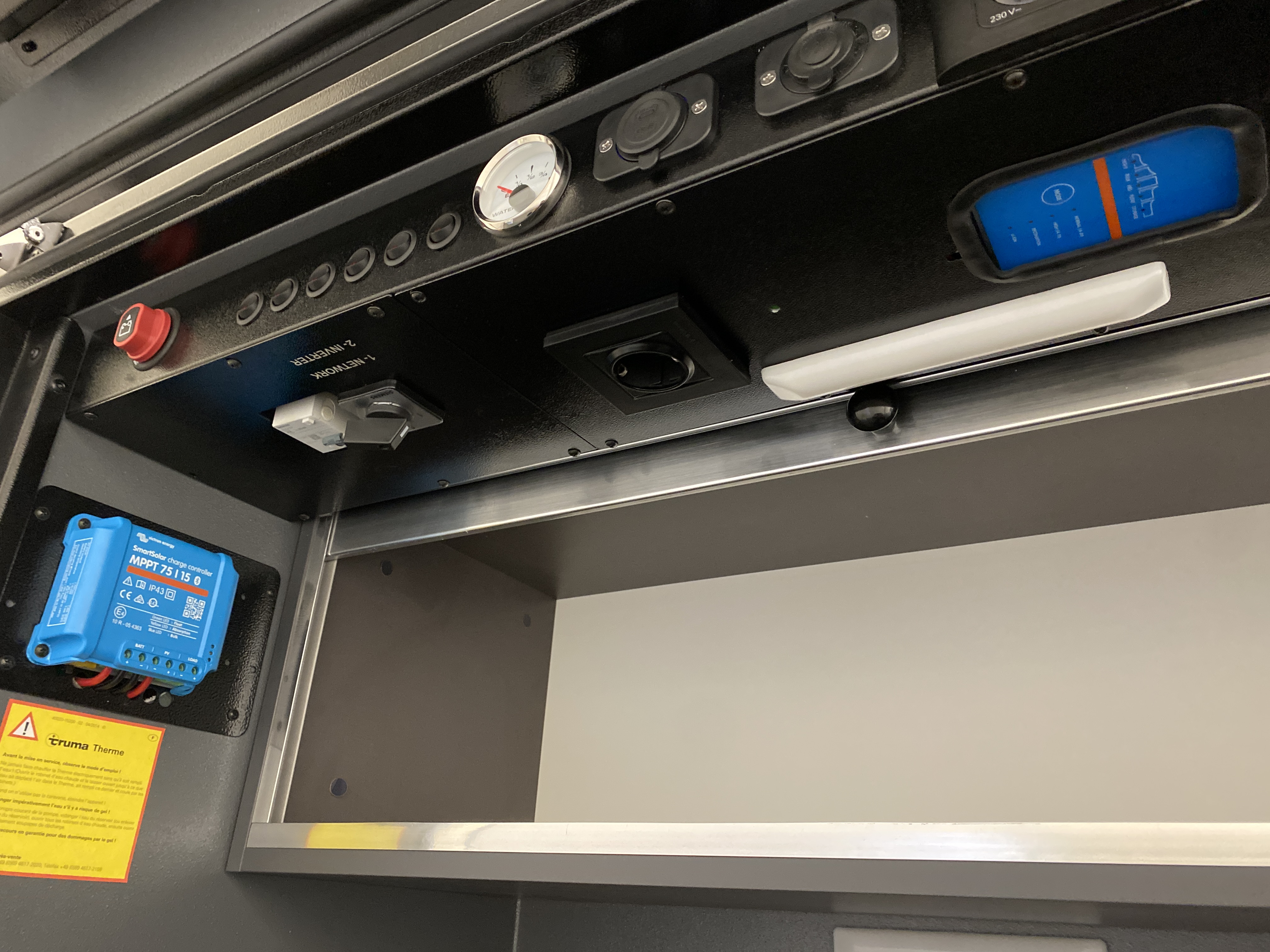 Panneau de contrôle complet comprenant une prise 12V (allume-cigare), deux prises 12V USB, interrupteurs et voltmètre numérique.