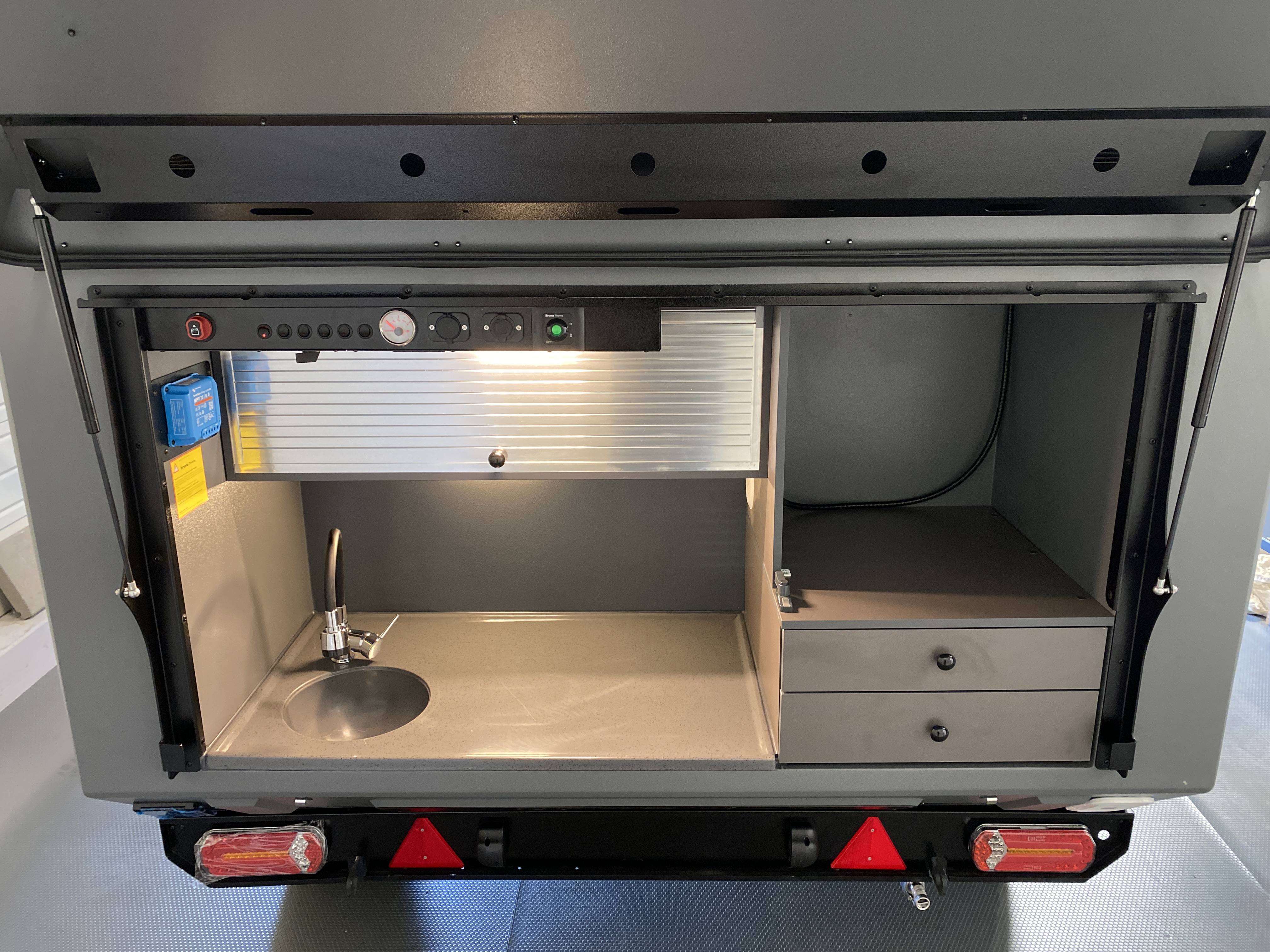 dans la cuisine 1*220V + 12V Usb + 12V rondedans l'habitacle 1*220V + 12V Usb + 12V rondeDouchette extensible pour la douche